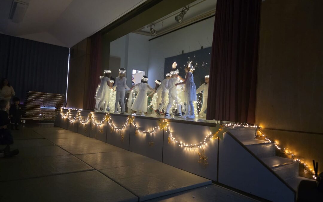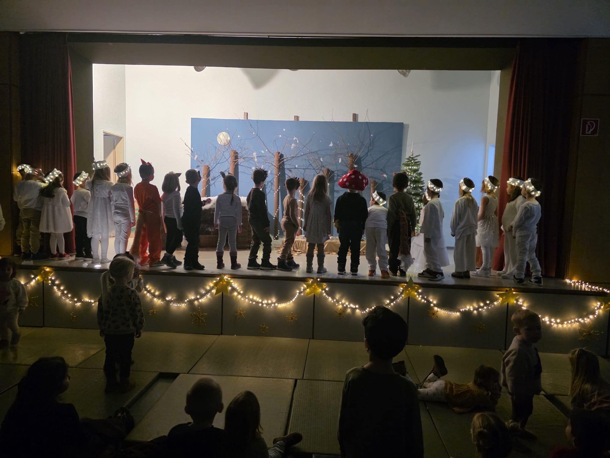 Das Highlight im Kita-Advent war auch in diesem Jahr das Theaterstück der Vorschulkinder, ergänzt durch einen liebevoll einstudierten Tanz. In der rührenden Geschichte machten sich Maus und Igel gemeinsam auf die Suche nach den Zutaten für ihre Weihnachtssuppe. Mit viel Freude, Mut und Kreativität verkörperten die Kinder die verschiedenen Tiere und brachten so den Zauber der Weihnachtszeit zu Eltern, Geschwistern und allen Zuschauenden.